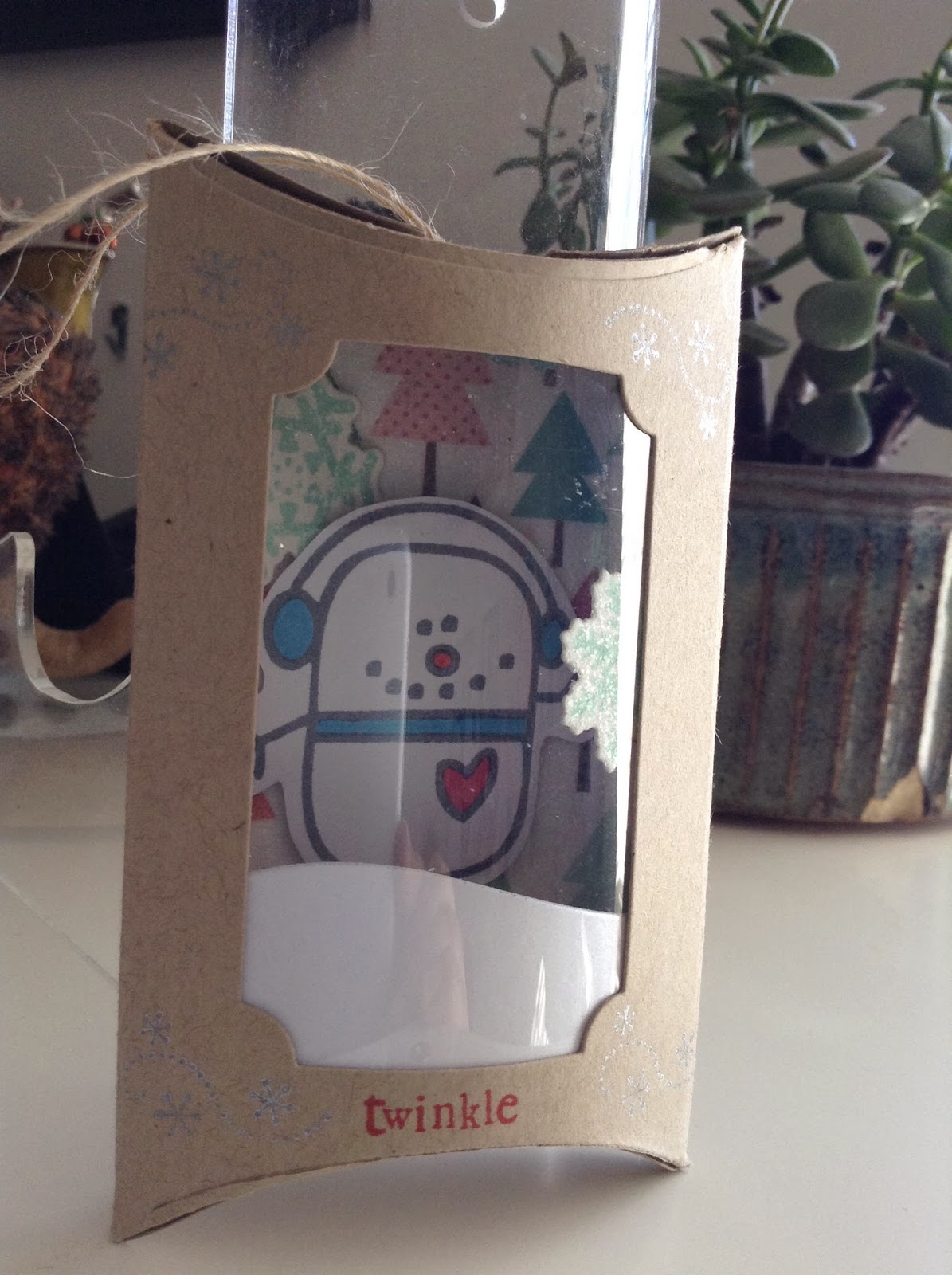 I don't have that awesome die Tiffany used, so I decided to use a pillow box die I had to create my ornament with a snowy scene inside (sorry for the slight glare):